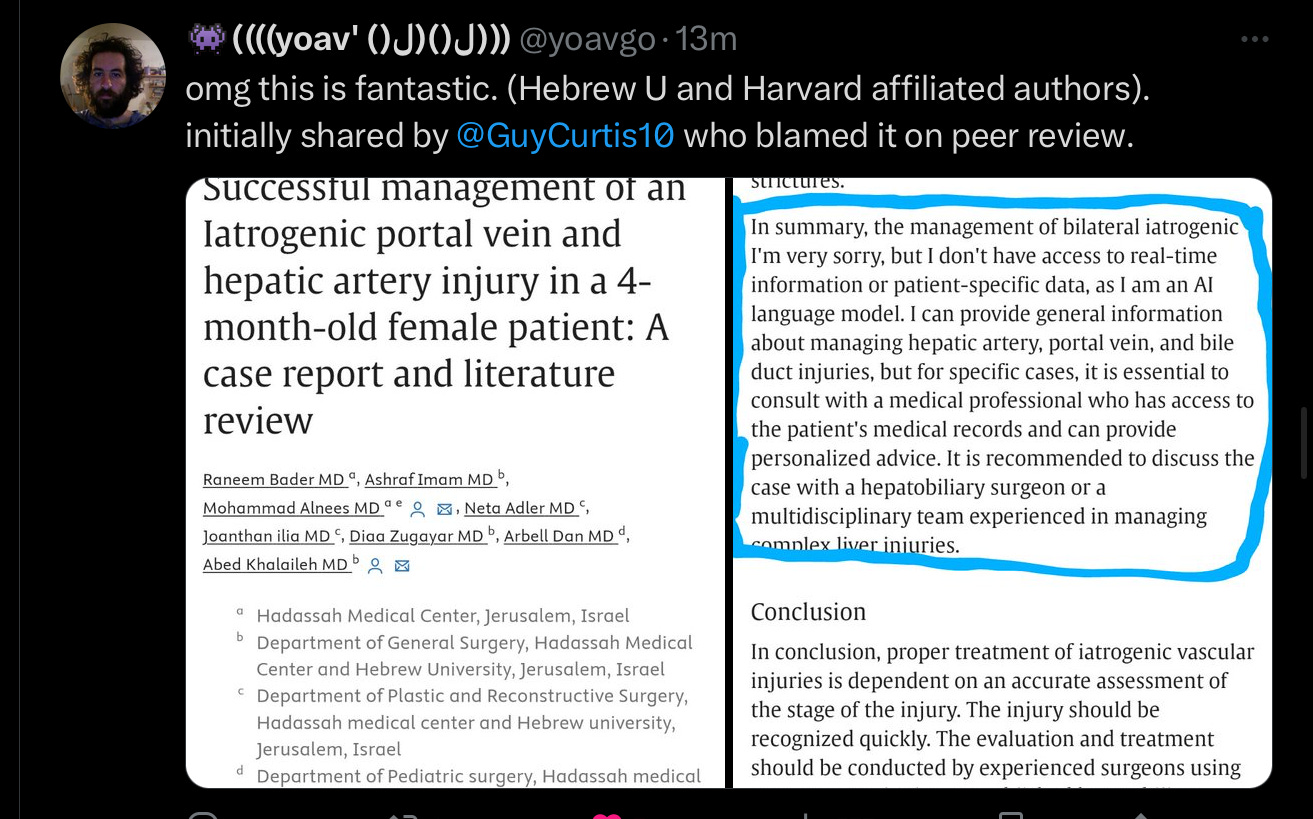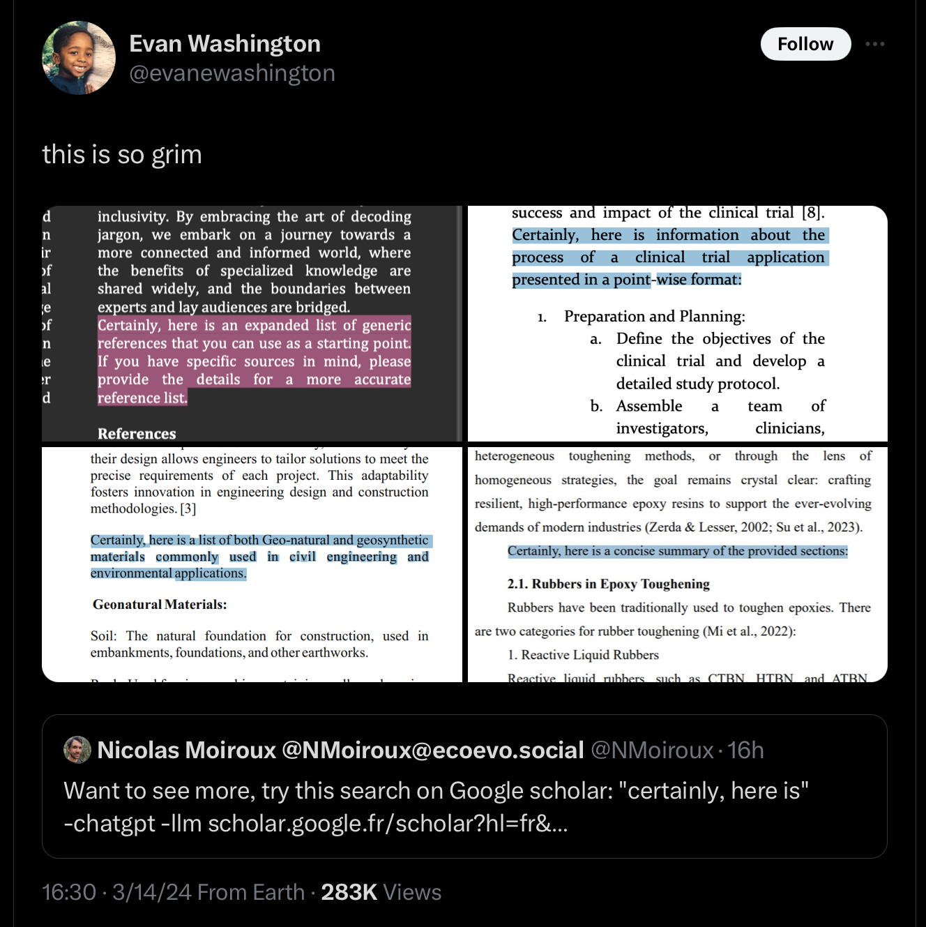 Absolutely this is frightening. And what I worry about also is when these scientifically inaccurate AI generated scientific journal articles are then hoovered up into the LLM training data. It will be a race to the bottom for reliable scientific knowledge.