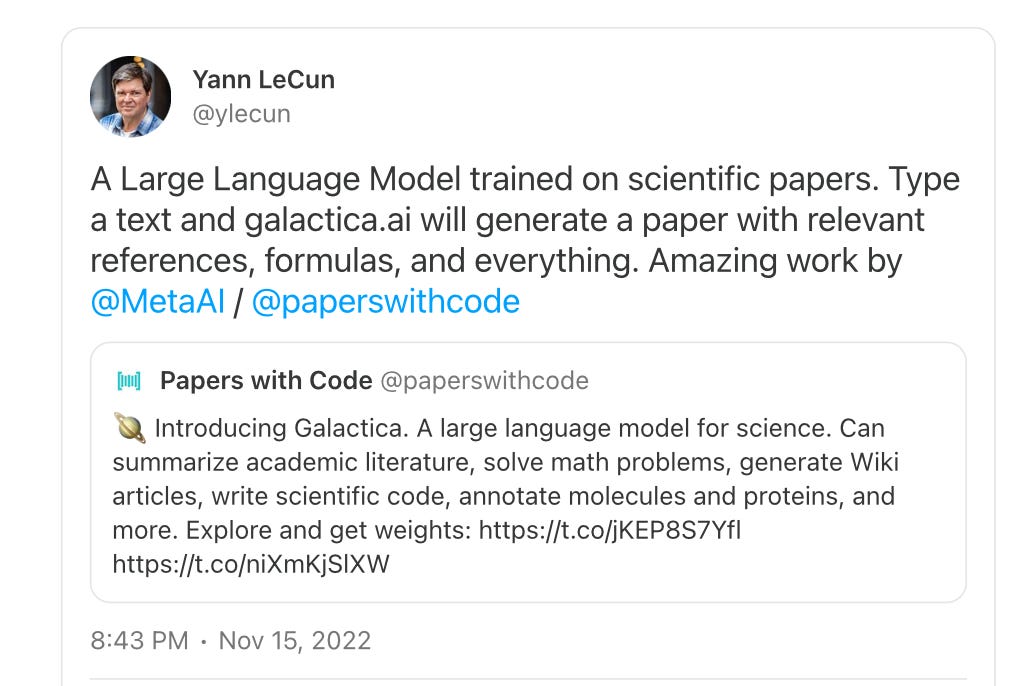 Over a year later, November 2022, LeCun was still loudly promoting (his company’s) LLMs as “amazing work”: