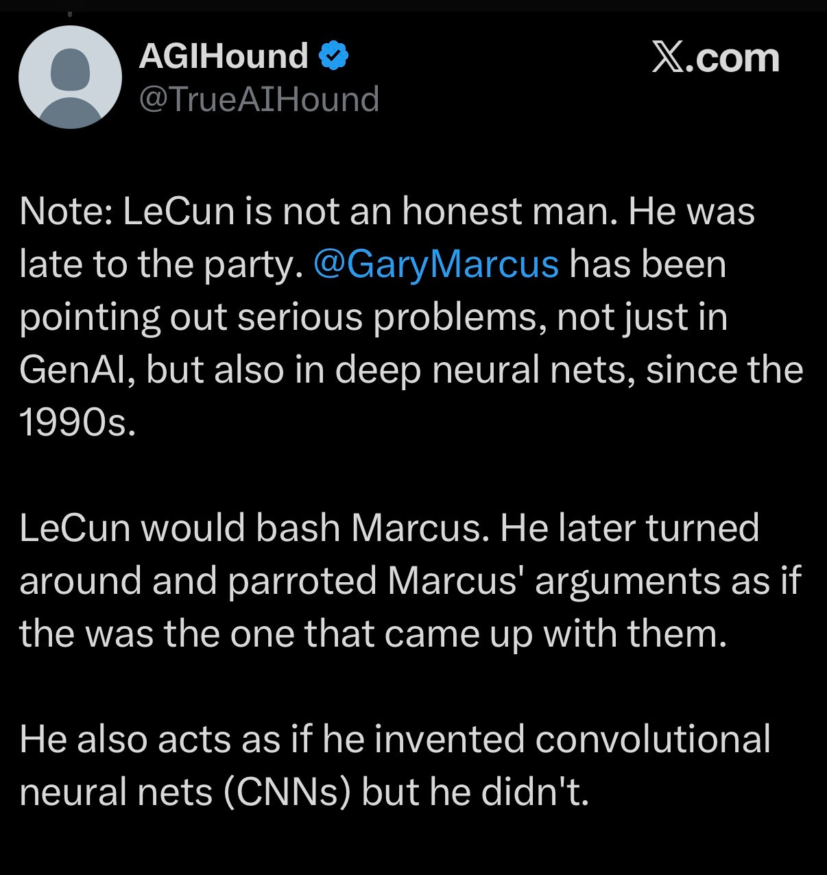 At the time LeCun was hardly supportive; instead he trolled my critique on Facebook. In no way has LeCun ever publicly acknowledged that I was on target with my conjecture that scaling LLMs would not lead to AGI. To the contrary, LeCun has repeatedly pretended that the anti-scaling idea originated with him, and he continues to falsely paint himself as the first and lone person to see this.