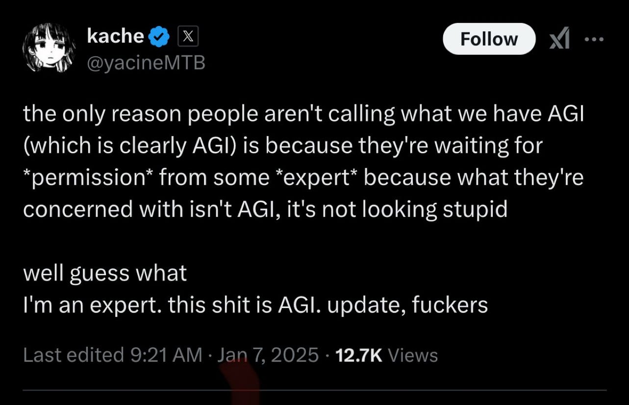 In the five stages of AGI Grief, this post (from an engineer at X) is halfway between “denial” and “bargaining”, with a healthy dose of “anger” - but no definition or engagement with the literature or criteria previously proposed: