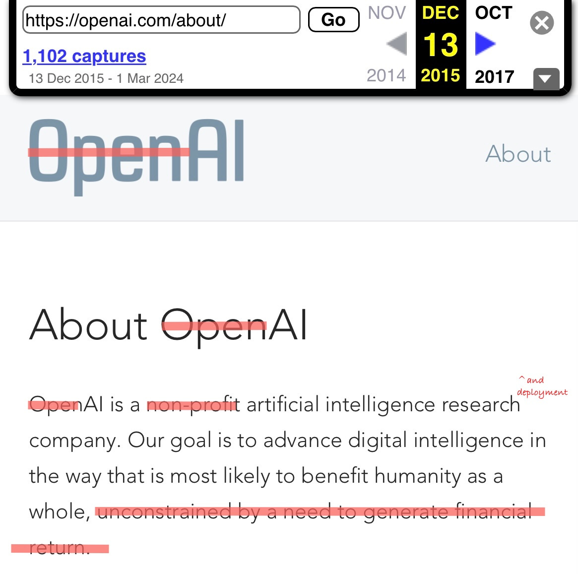 Dropped is any mention of (a) the nonprofit (even though legally the company remains a nonprofit), (b) open source, once central both to their mission and name, and (c) the original phrasing about being "unconstrained by a need to generate financial return."