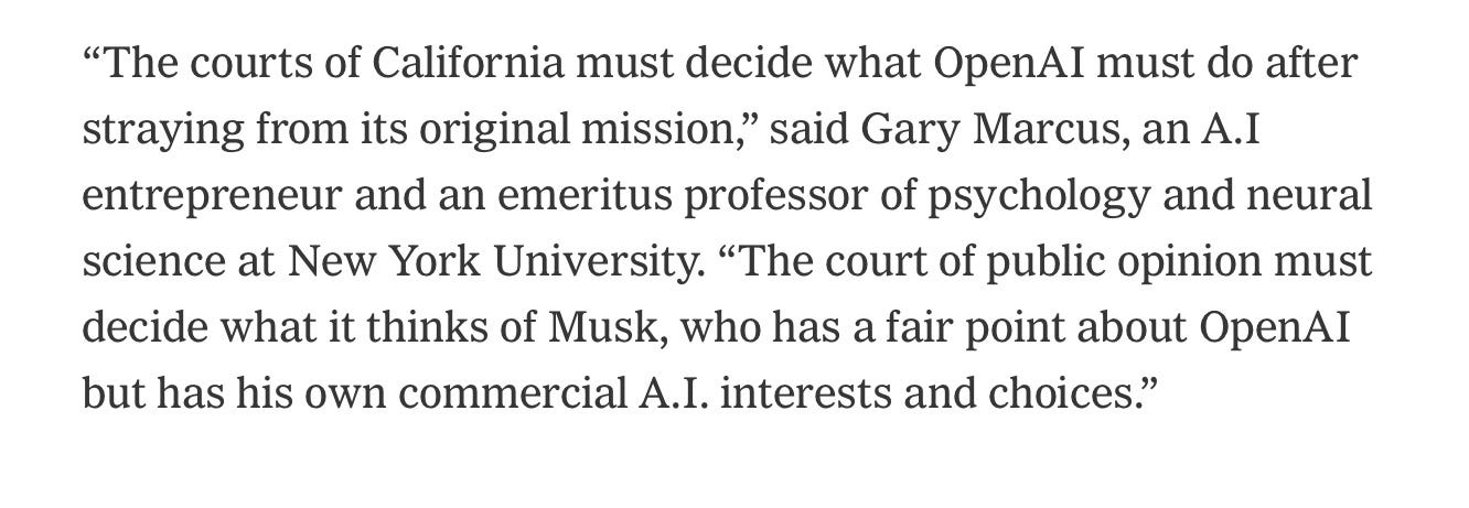 Courtroom quarrels are likely to focus on documentation of their agreement, rather than the real issue: which is whether OpenAI is still built around helping all of humanity. In my view, humanity has now taken a back seat to money; their choices now seem very directly anchored in a need to generate a massive return, in direct contradiction to their promises to California, to Musk, and to the world.