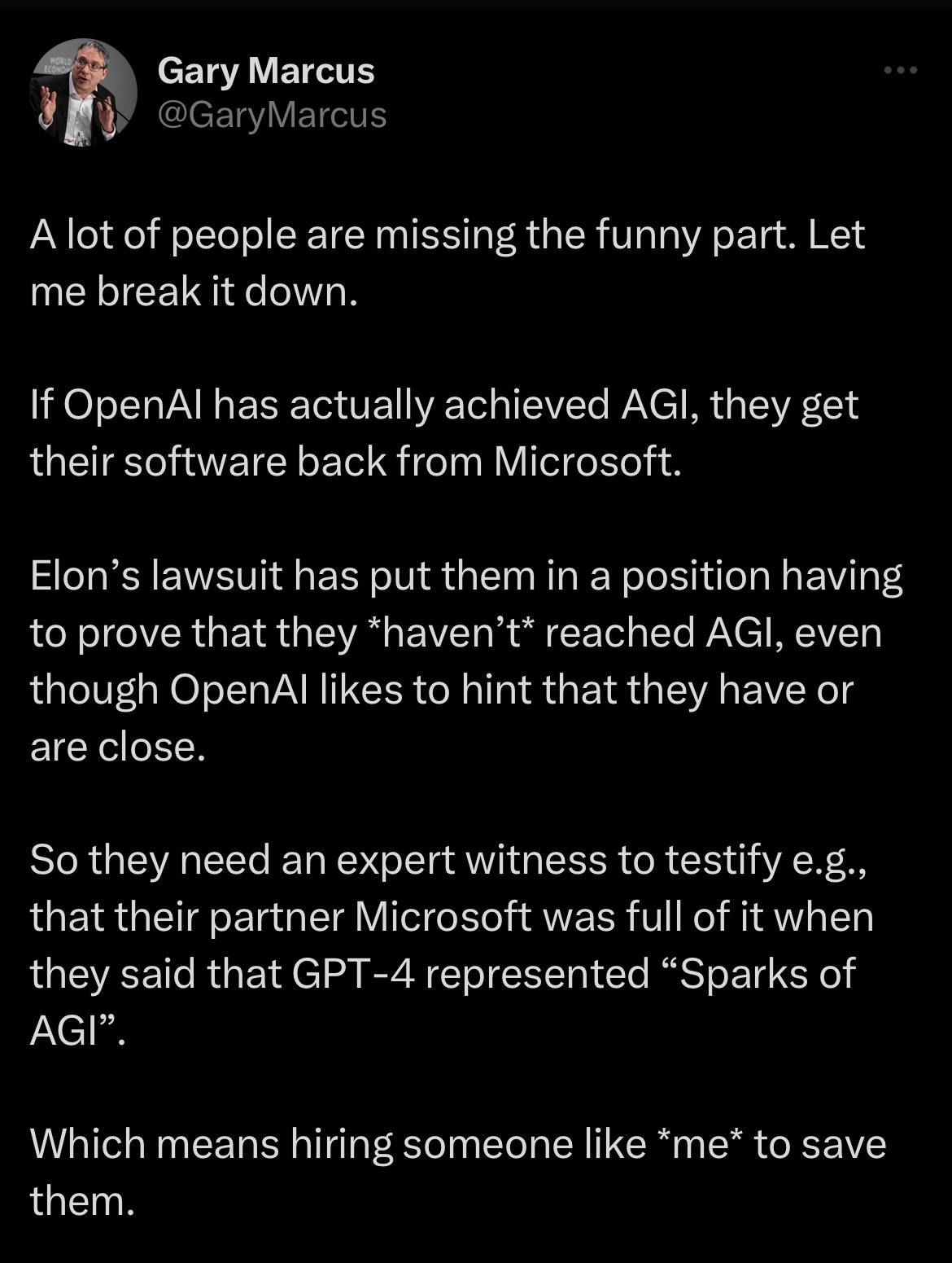 Musk's lawsuit, combined with OpenAI's bizarre arrangement with Microsoft in which the continuation of an exclusive license rests on whether or not OpenAI has achieved something that is difficult to define (AGI) has left OpenAI in the position of needing skeptical experts to deflate their own hype. As Elon himself put it in reply to my tweet: