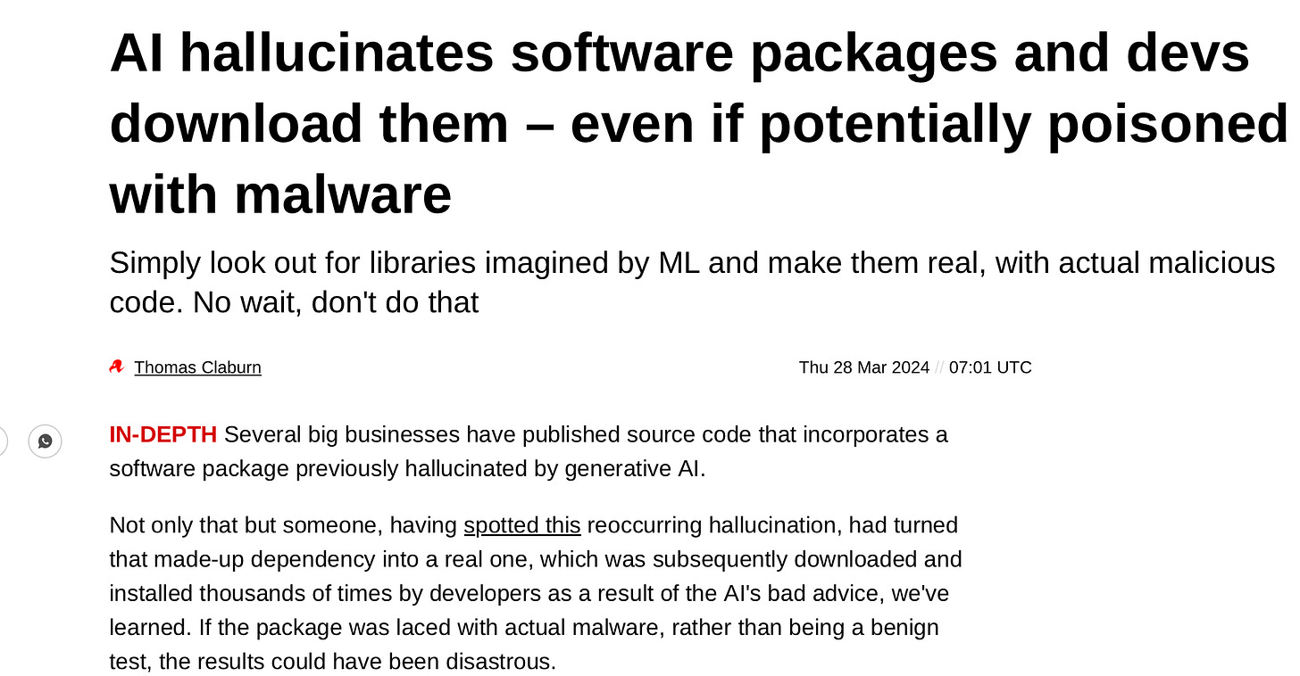 Let’s look at the race itself first. Opinions could vary, but in my opinion, the race is not going great. One the one hand, we have big promises for AI helping in domains like medicine, and computer programming, but the inherent unreliability in these systems is deeply worrisome. An example in a story I just saw that could unravel some of the gains in programming is this: