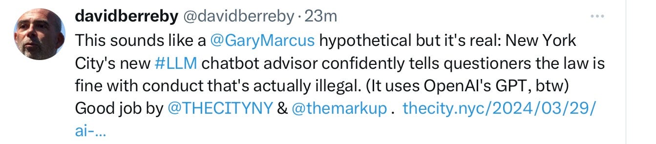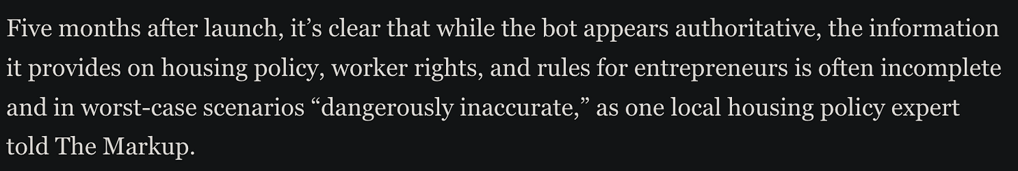 Here’s another case, just shared with me. Microsoft Azure is providing advice, under the auspices of New York City, about New York City law; OpenAI’s GPT-4 is presumably used underneath.