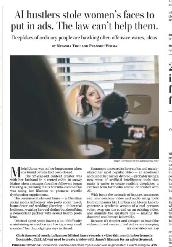 An influencer’s face was used (without her permission) and cloned her voice to sell erectile dysfunction supplements. That cuts into her businesses, fleeces buyers, etc. And per the article, there’s no law that can do much about it. Really gross stuff.