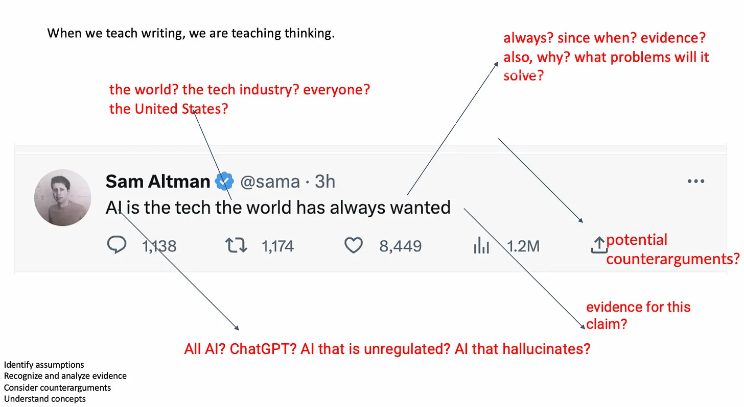 It’s not the first time Rosenzweig has raised an eyebrow over Altman’s remarks. Here’s a classic that she likes to deconstruct in her writing classes, which again shows how Altman’s superficially compelling rhetoric tends to hide from counterarguments while ignoring alternative perspectives. Annotations are hers: