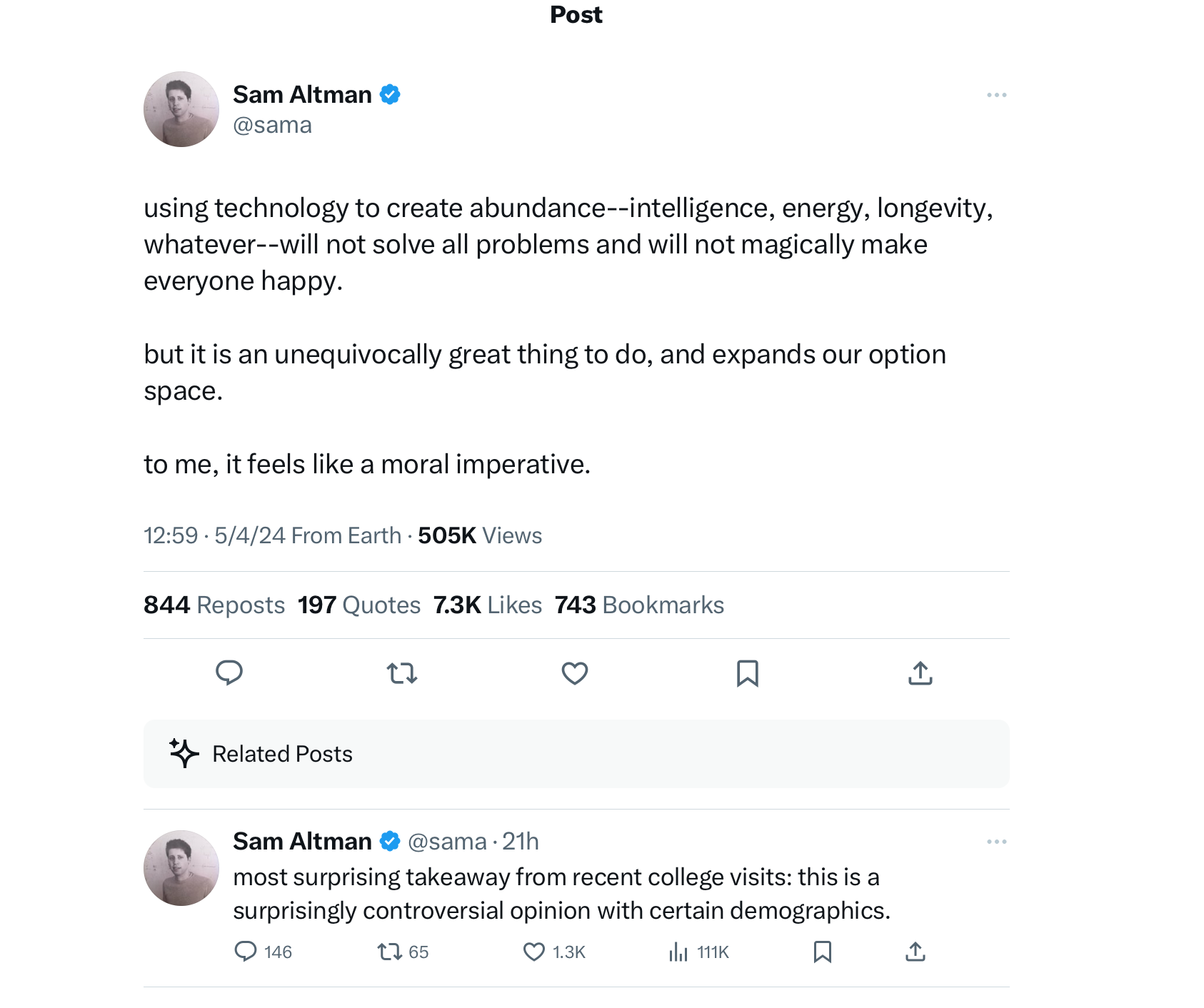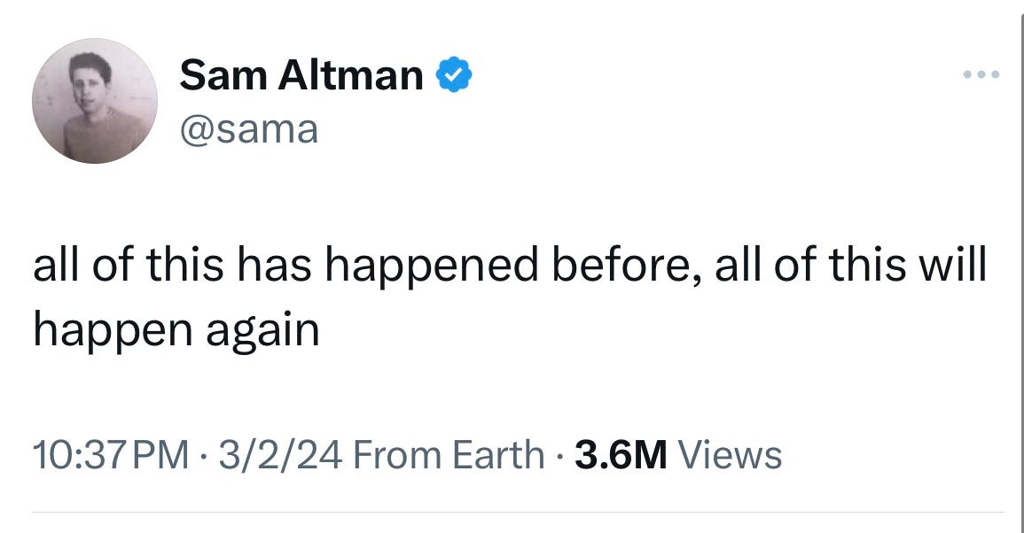 said to me this morning: "Altman is a guy who has the potential to put whole industries out of work who is saying, with no capital letters, that what he's doing is what the world has always wanted and then acting surprised that anyone has questions. It's truly amazing in a sense."§