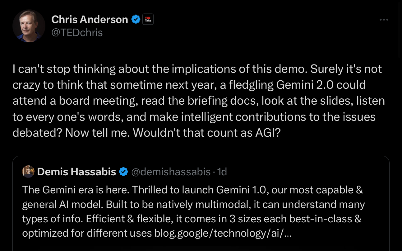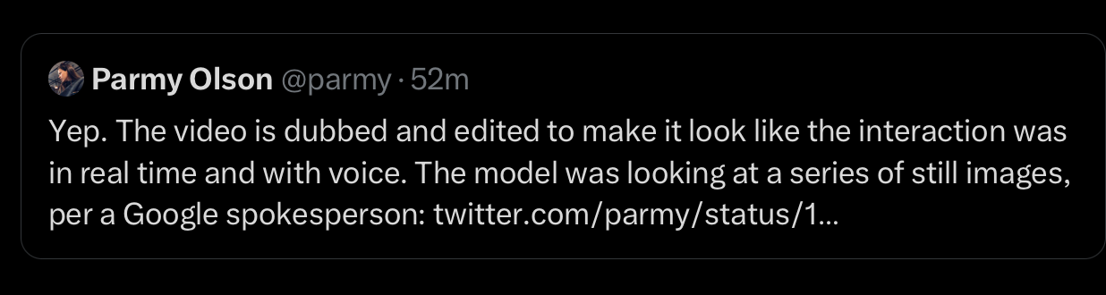 Seems like it was only yesterday when Google announced Gemini with a spectacular video, featuring incredible real time interactions (link just above). Some of my friends and colleagues got very excited by it (memo for next time: they should have checked with me first), posting tweets like this: