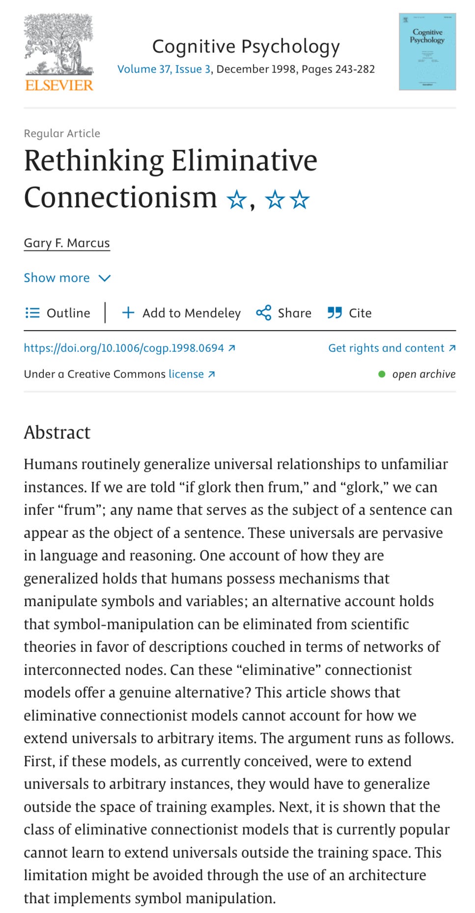Here’s something I wrote in 1998, generalizing and further developing some of what Pinker and I had written about a few years before, in what I often think has been my most important scientific article. (Eliminative connectionism refers to neural network approaches that try to get away with cognition without symbol manipulation; I was talking about the forerunners to LLMs there.)