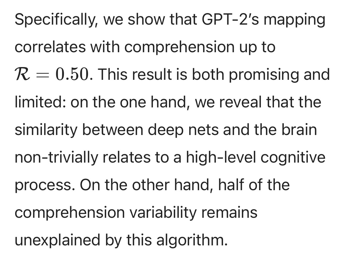 It's fascinating that the authors conclude that GPT-2 "may be our best model of language representations in the brain" when really what they have is a 25% correlation between one layer of GPT-2 and one aspect of the data. If they mean "our best (simulated) model," then I guess they might have a point, although it's hard to know what being the best AI model of any cognitive process is worth at this point. If they mean "best model (period)," that's quite the claim.