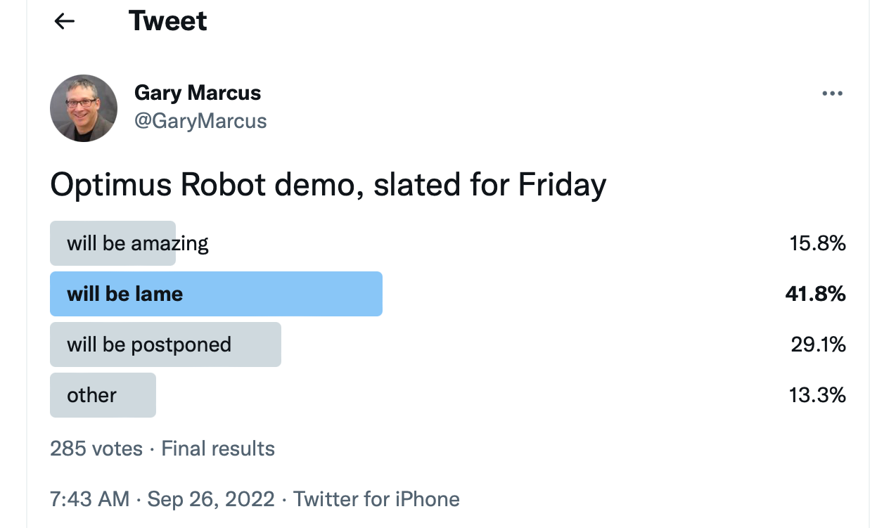 The real problem w robots has never been demos, anyway (there have been many, for decades); it’s making robots in robust in the real world. One more dancing robot wouldn’t tell us much about whether Tesla was close to (say) a real general-purpose domestic robot, and the robotics community would be rightly skeptical if that’s all that we saw.
