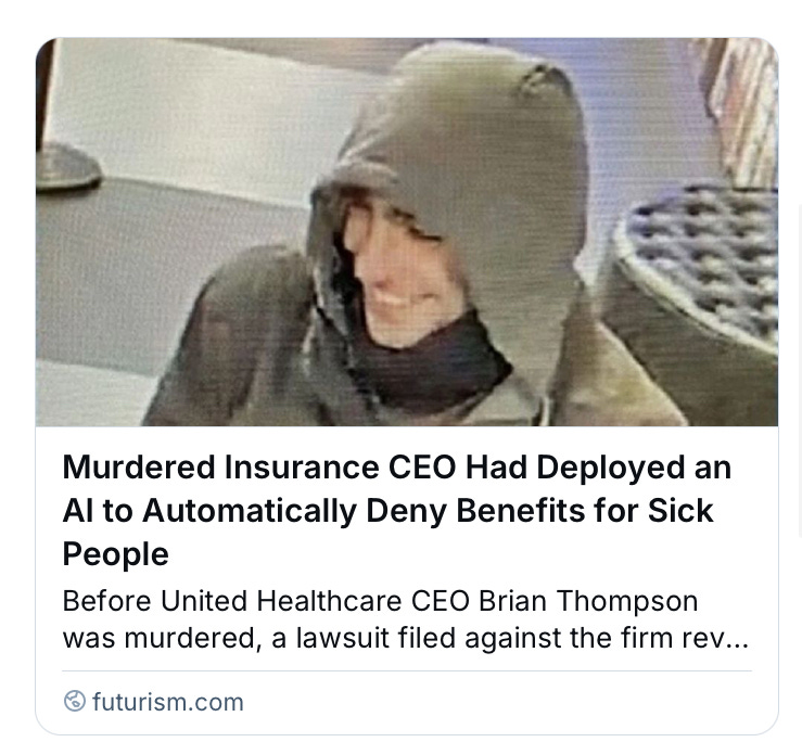 I don’t condone the violence, but I certainly understand why people are angry. And it’s not just United; one of the biggest applications of AI seems to be ripping off customers. According to Stat, as summarized elsewhere, “multiple major health insurers had used secret internal rules and flawed (AI) algorithms to deny care.”