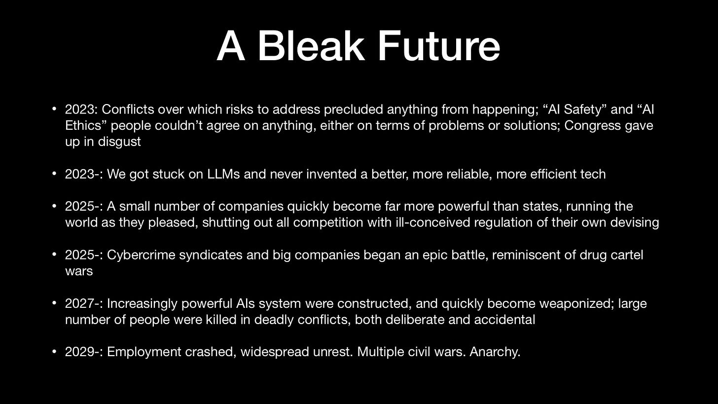 There is a possible world in which the tech oligarchs press forward today’s unreliable AI in the service of battlefield weapons and screwing people out of health insurance claims, leading to class warfare like we have never seen in the US, with the rich flying around in helicopters to avoiding interacting with the masses.