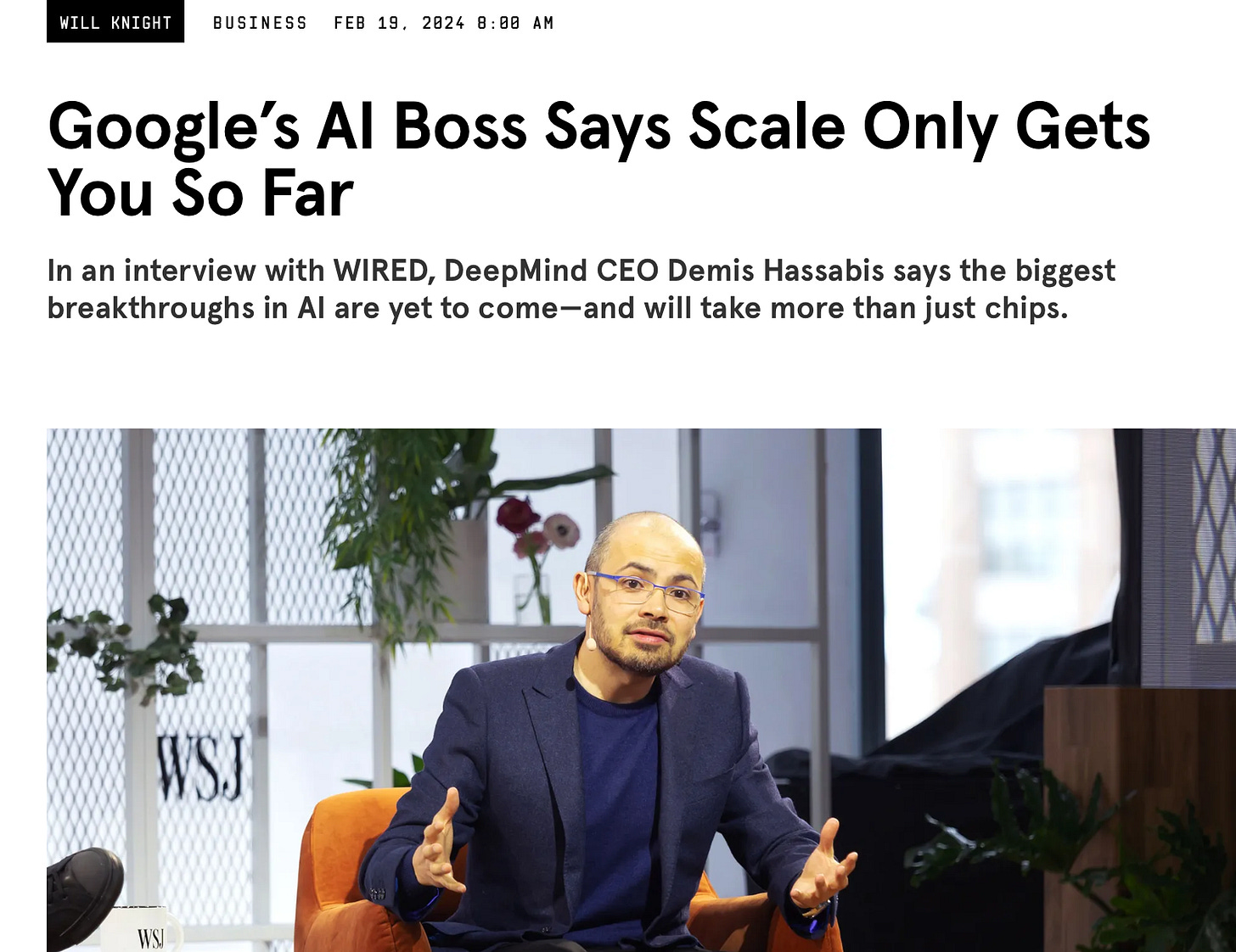Implict through the essay: scaling might not solve the problems not above. Pending/Still true, and people like Bill Gates, Demis Hassabis, Yann LeCun, and Sam Altman have all recognized that a plateau might be coming. Here’s Hassabis, last month, echoing the central thrust of my 2022 article: