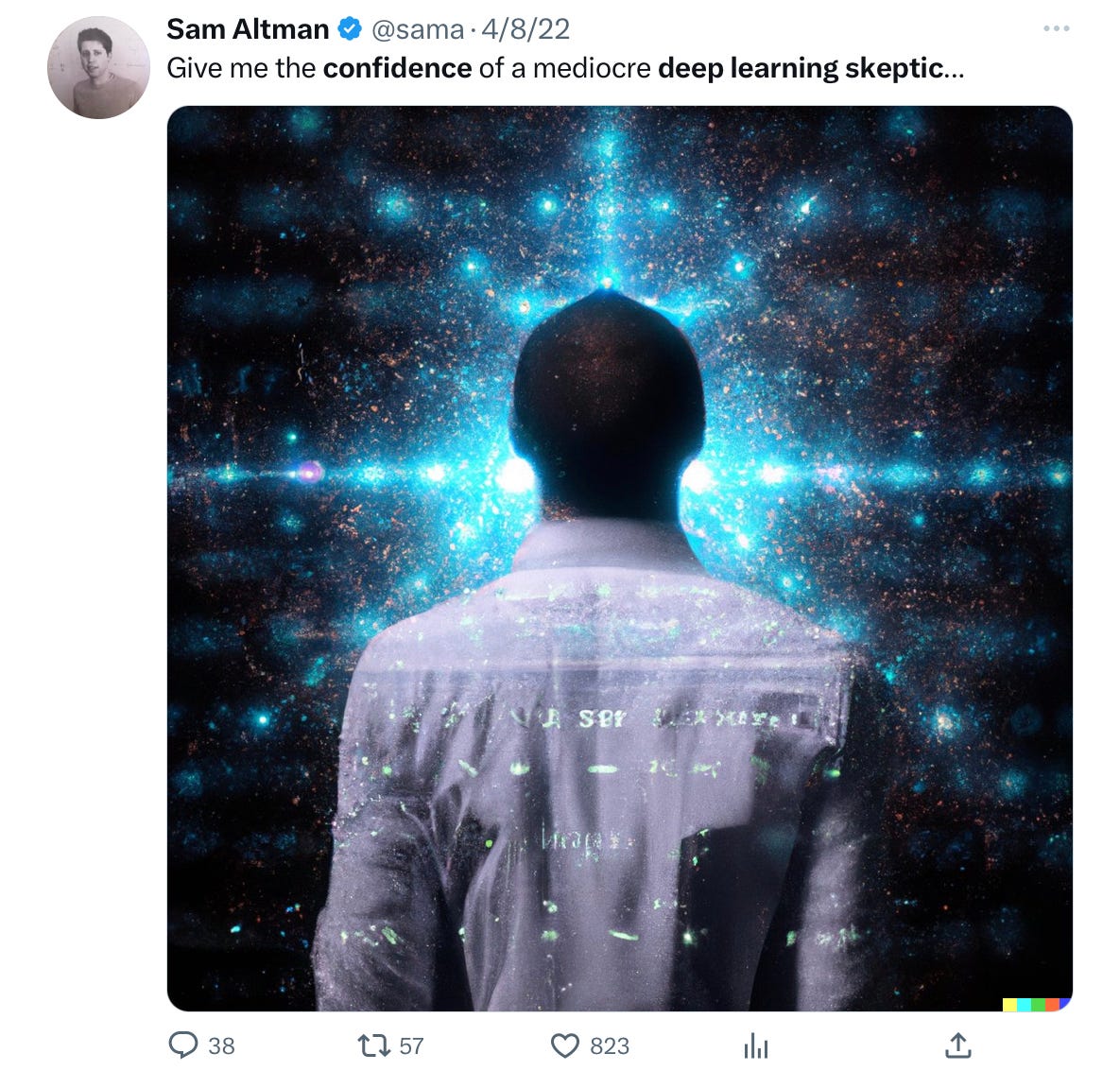 I don’t think many people read it (except for the title), but a lot of people expressed opinions. On Twitter, as it was called in those days, hundreds loved it. Thousands hated it. A month later, after Dall-E came out, Sam Altman ridiculed it (note the clever artwork!)