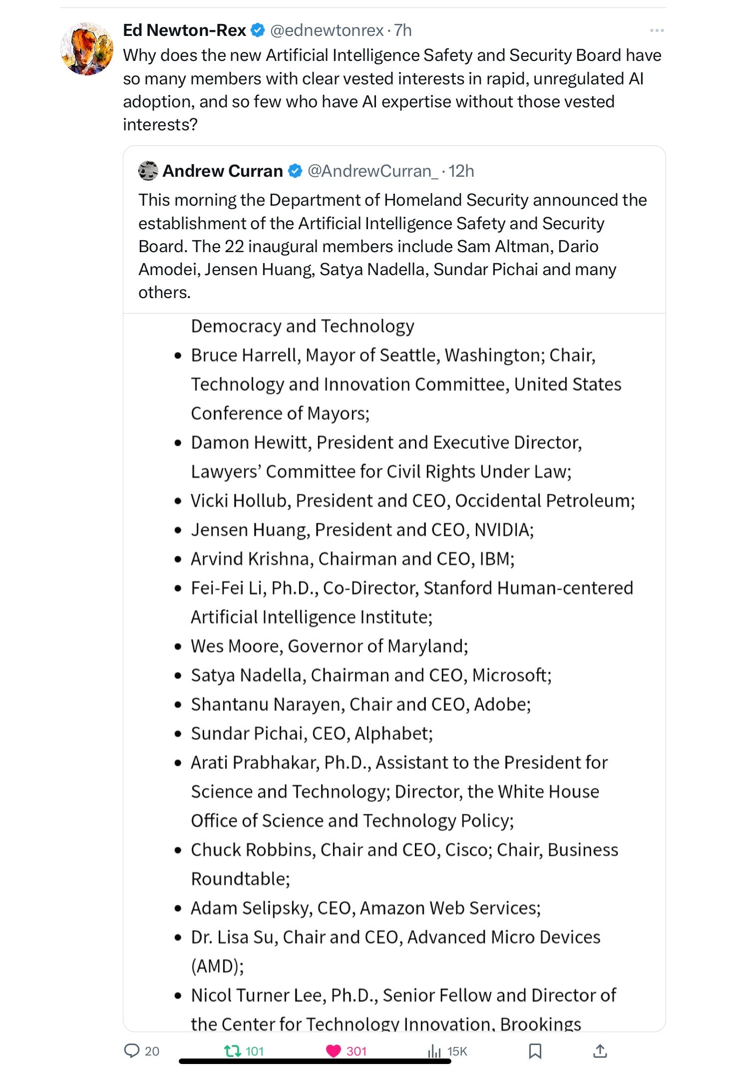 So it was mega-weird yesterday to finish reviewing the copy-edited manuscript of my book (pretty much the last chance to make significant changes) and see at exactly that moment yet another vivid example of Washington sucking up too much to Silicon Valley: a new blue-ribbon commission, largely overlapping with the one that Schaake rightly criticized, in large part made up of the same tech CEOs. One legit scientist that I respect was added – Fei Fei Li. But basically it’s regulatory capture all over again. Technologist/activist Ed Newton-Rex said it nicely in a X post that mirrors Schaake’s from August: