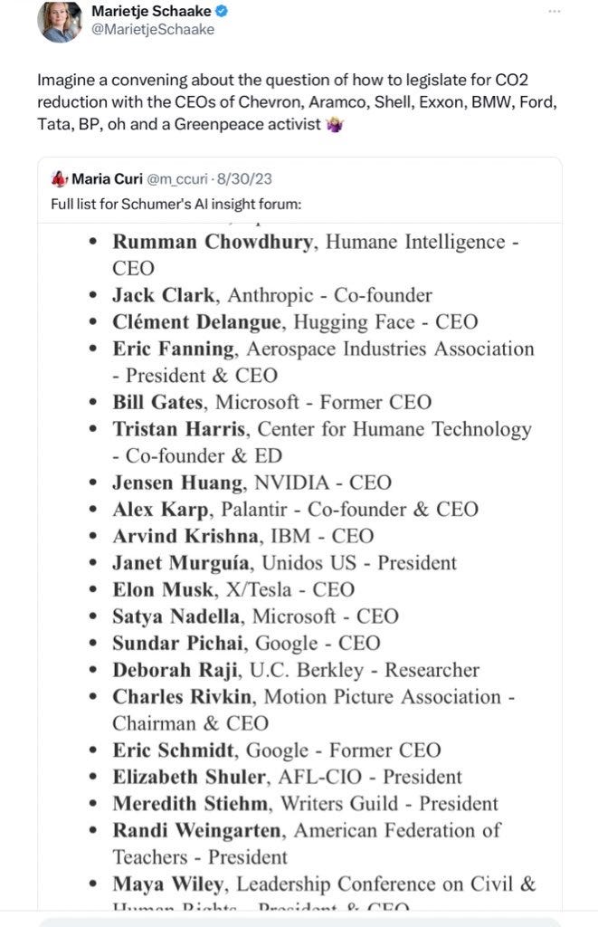 The queasiness I felt after the White House photo op increased in September, with an event organized by Senator Schumer, arguably the single most important player at the moment, since as Majority Leader he decides what legislation around AI might be voted on. In something of a replay of that May White House meeting, Schumer held a widely publicized but closed-to-the-public meeting on AI, again treating the tech CEOs as rock stars, and again largely leaving out independent scientists.