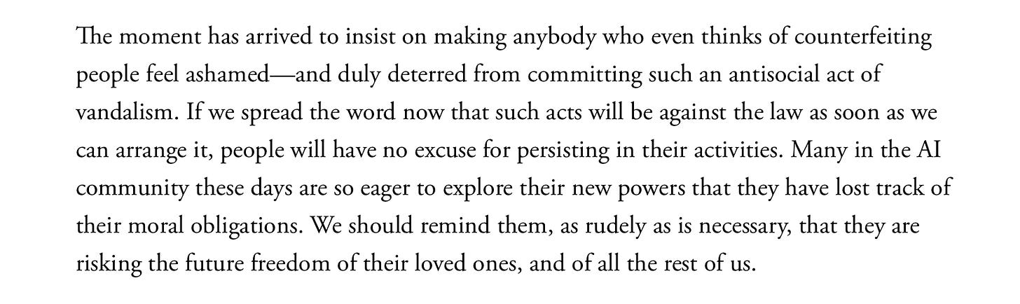 Tell your representatives today, not tomorrow, that we must pass federal1 laws forbidding machine output from being presented as humans, and that we must develop the means to enforce those laws. No use of the first person by chatbots, and no more deepfakes of living people’s voices and images without their express consent, aside from carveouts for obvious parody and so on. All of this has gone too far, too fast. And we must not let corporate lobbyists thwart efforts to address all this.