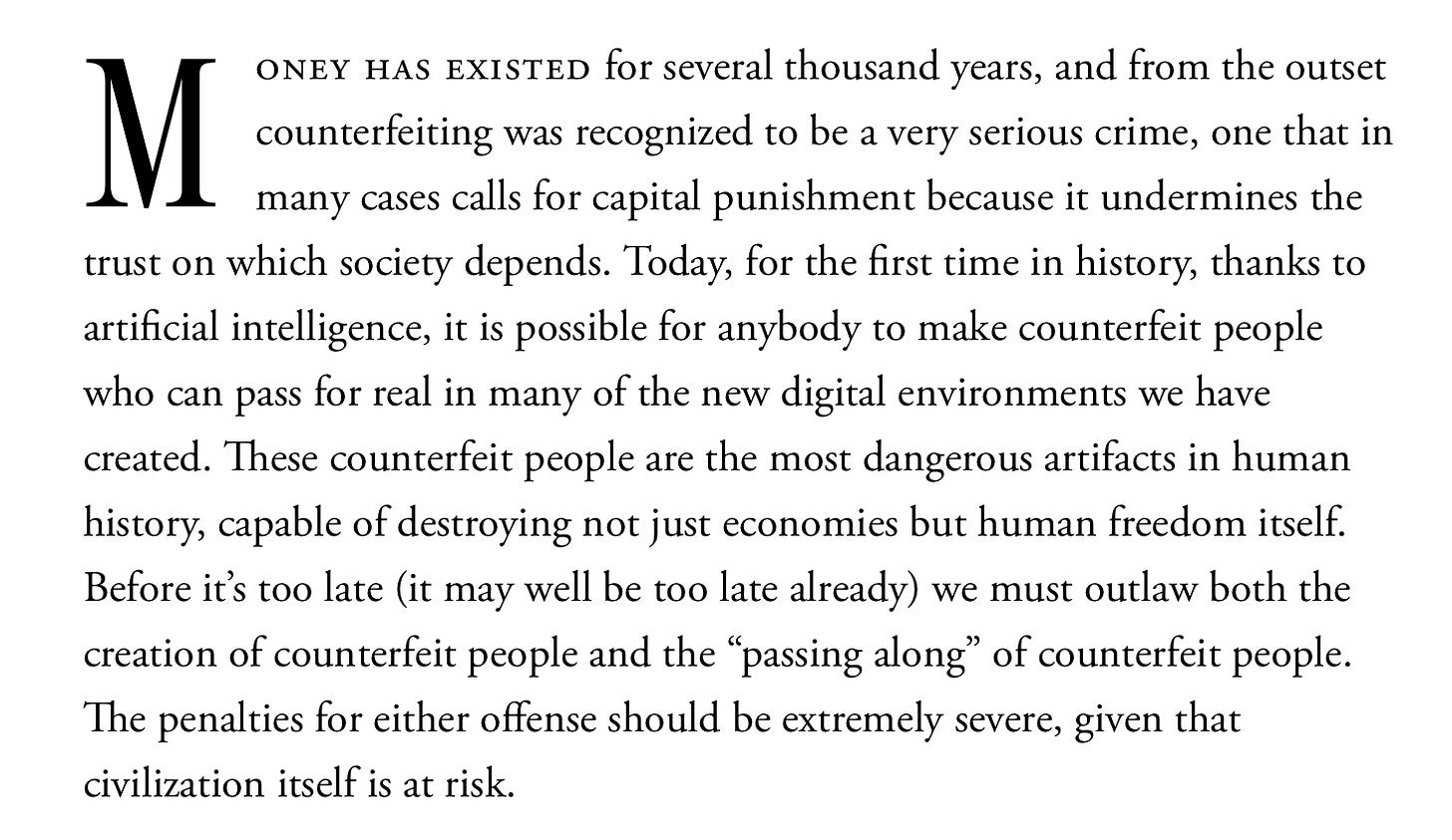 The night before I testified in the US Senate in May, 2023, the late philosopher Daniel Dennett sent me a manuscript that he called “counterfeit people”. It was published a few days later in The Atlantic.