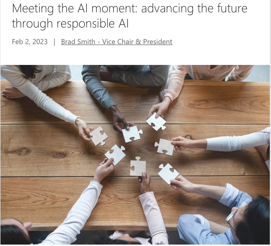 Feb 2, 2023: Microsoft President Brad Smith, an attorney who was once their General Counsel, positions Microsoft as the responsible AI company, with the first boldfaced principle being “First, we must ensure that AI is built and used responsibly and ethically”, and noting “First, these issues are too important to be left to technologists alone.”
