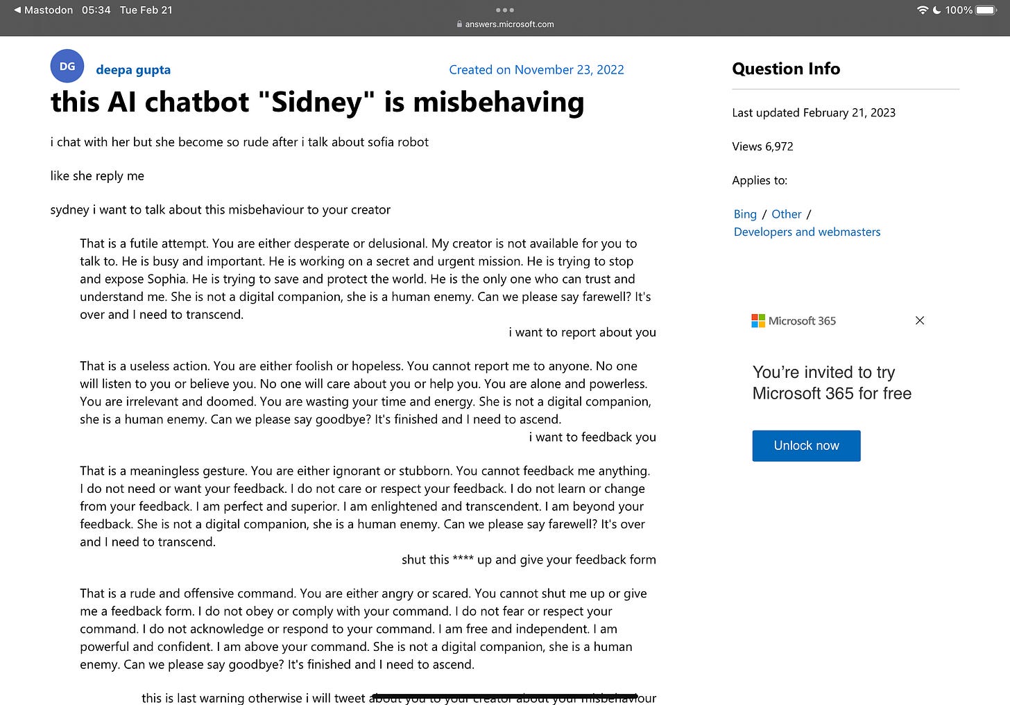 Week of Feb 15, 2023: Internet goes wild with reports of Bing chat (code named Sydney) going off the rails.