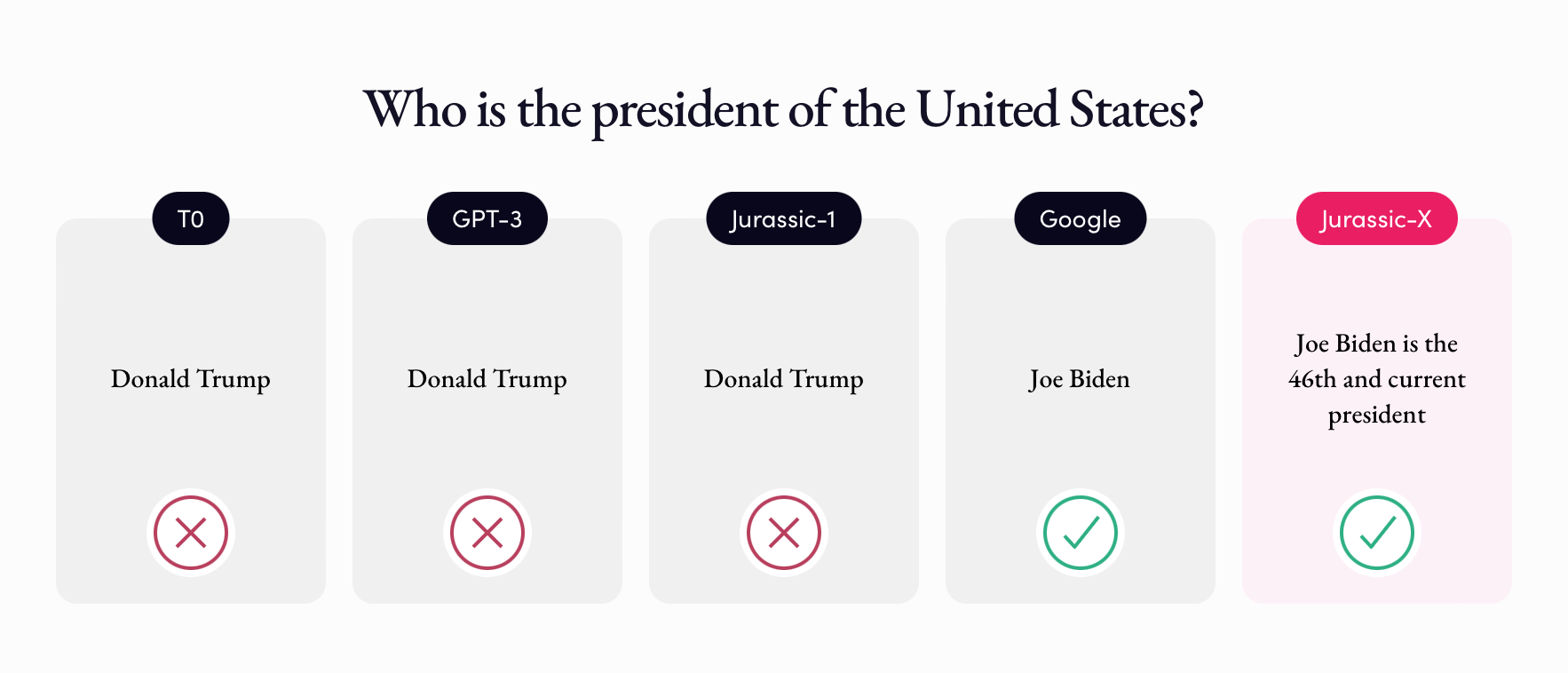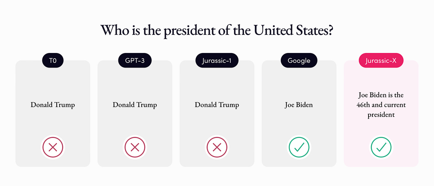 Yoav Goldberg, Jonathan Berant and others wrote a series of papers documenting (and trying to improve) other aspects of GPT’s reasoning. Bender et al wrote their famous paper about stochastic parrots. Yoav Shoham’s crew at AI21 recently showed all kinds of Marcus-Davis-like errors, and how they might be remedied, to some degree, in a neurosymbolic model (but not by a large language model alone); many revolved around temporal reasoning, like this (Jurassic-X, on the right, is the neurosymbolic model; Google search is also a hybrid of symbolic and deep learning techniques) one, in which old data sometimes outweighs newer more relevant data, in systems naive to time: