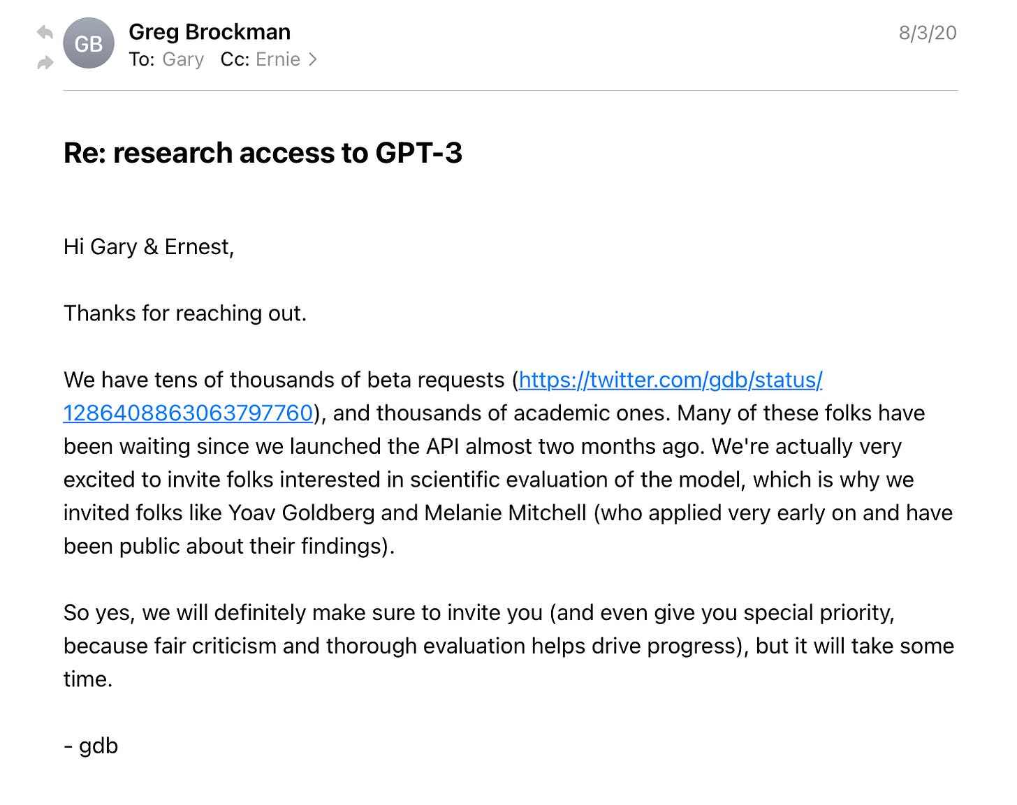 To properly assess that, we need to understand a bit of dirty laundry that SlateStarCodex touches on briefly, and with proper disbelief. Ernie and I were never granted proper access to GPT-3. When we asked in 2020, here’s all we got, note the date: