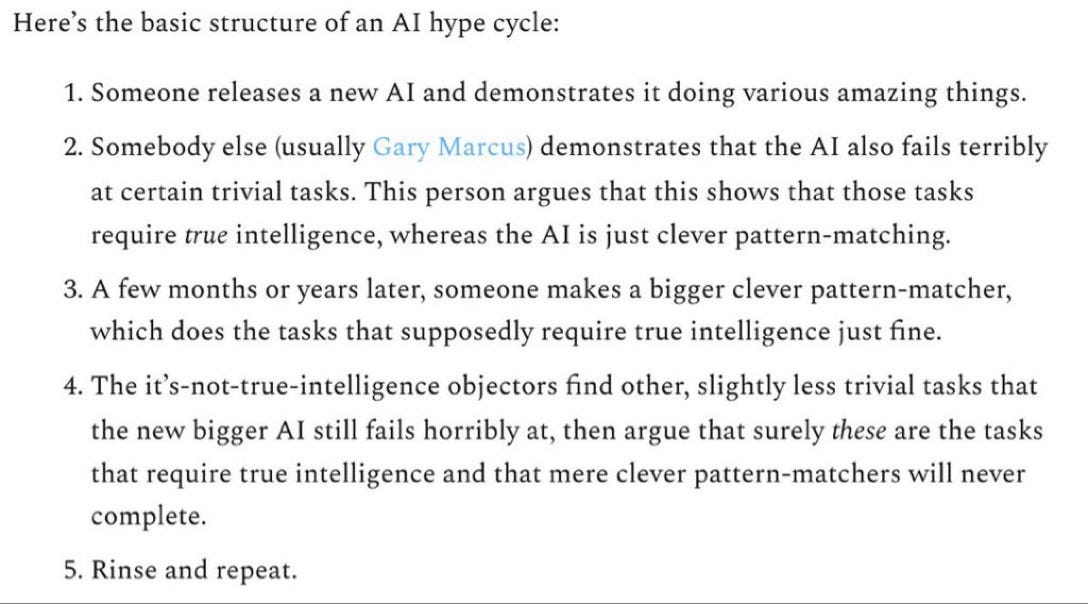 Somebody else (usually Gary Marcus) demonstrates that the AI also fails terribly at certain trivial tasks. This person argues that this shows that those tasks require true intelligence, whereas the AI is just clever pattern-matching.