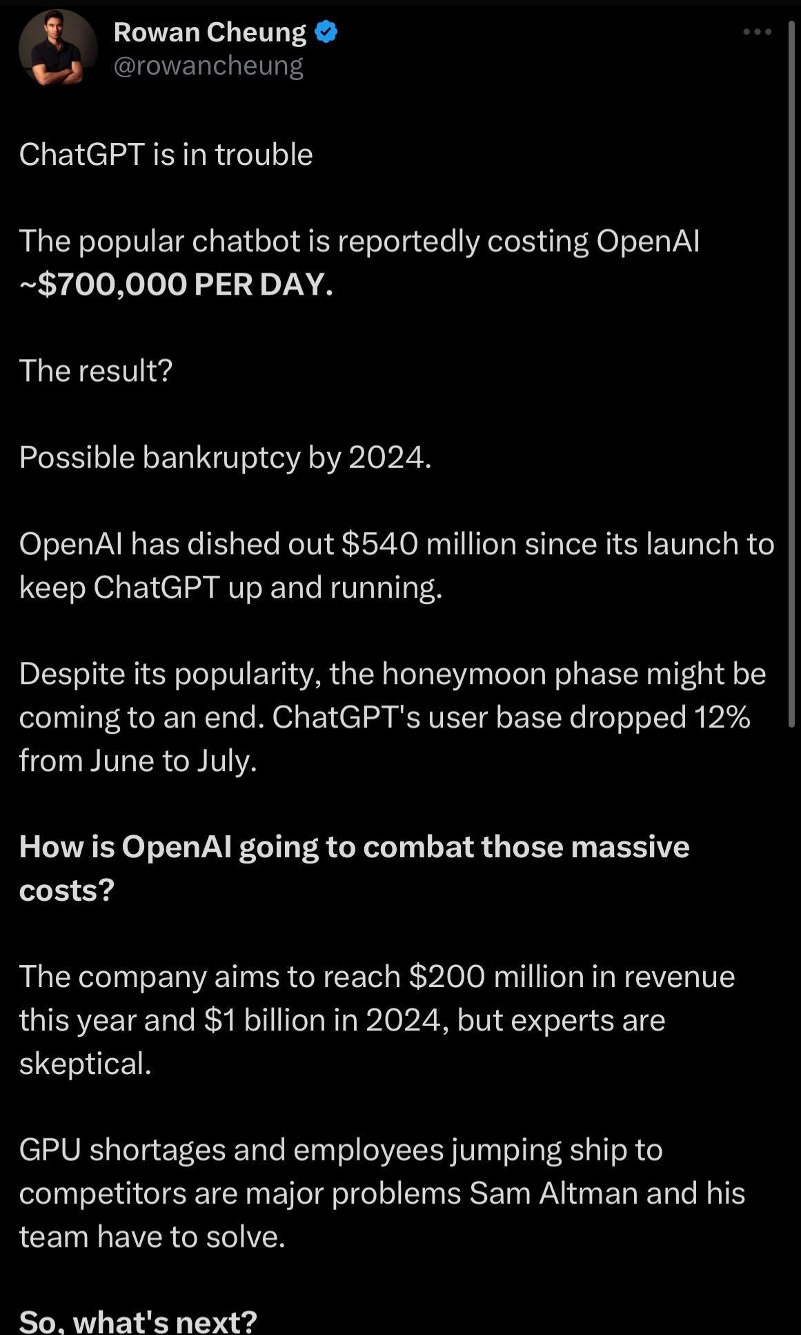 And so far Generative AI hasn’t. Maybe hundreds of millions, probably not billions. certainly not hundreds of billions. A rumor that’s been circulating the internet in the last few days went so far as to suggest that OpenAI could even face bankruptcy, possibly as soon as 2024, per a tweet from Rowan Cheung.that got deleted almost as quickly as it got posted.