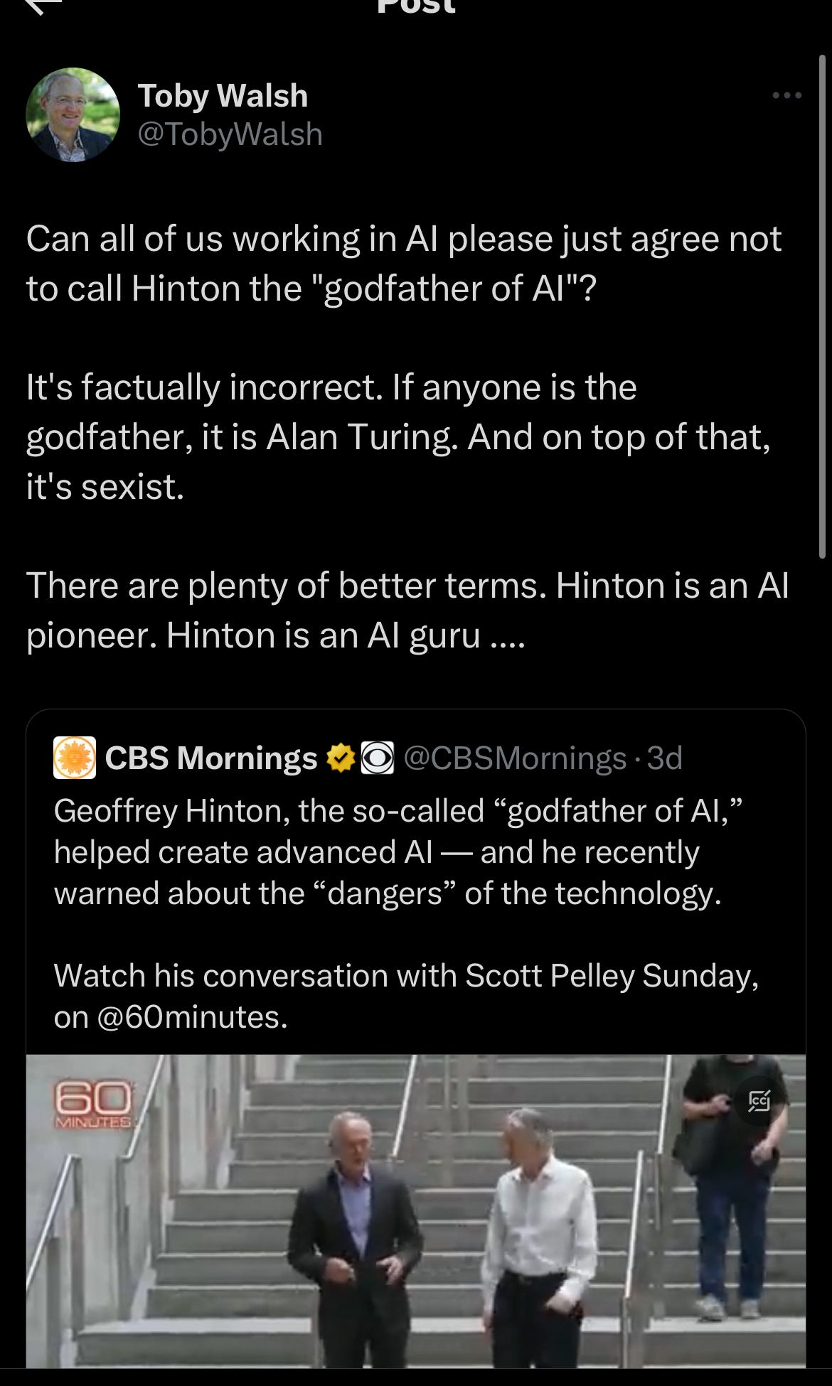 And that’s worth noting, too. The fact that the interview is not what it should have been doesn’t take away from the bravery in Hinton’s speaking out about some legitimate concerns. If I am correct, he is wrong about some of the science, but right about what’s at stake.