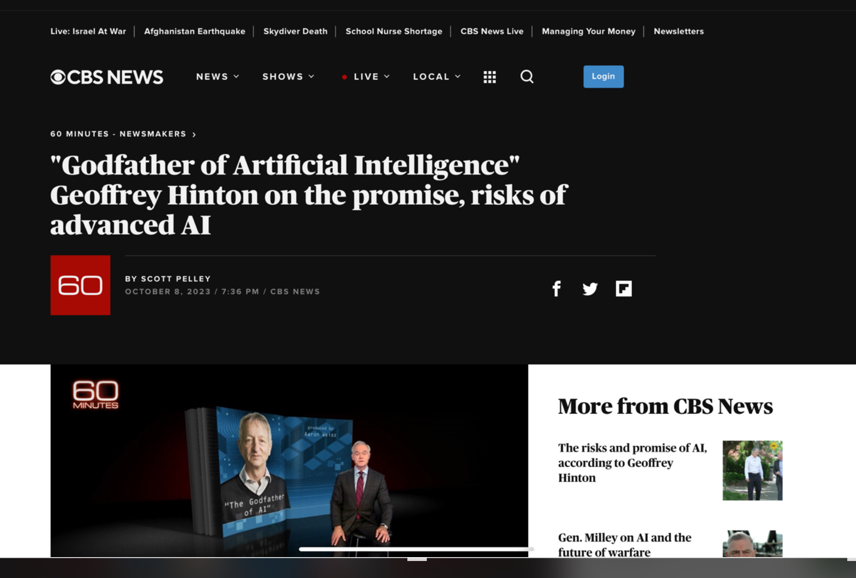 Postscript, well put by Toby Walsh below, and mentioned by several over the years, never acknowledged by CBS in their advertising for their segment: Hinton did not in fact give birth to AI. Thee field itself is generally said to have launched at a conference at Dartmouth in the summer of 1956, though anticipated earlier in the writings of Alan Turing and others. Hinton was 8 years old at the time of the conference, and not present at the proceedings.