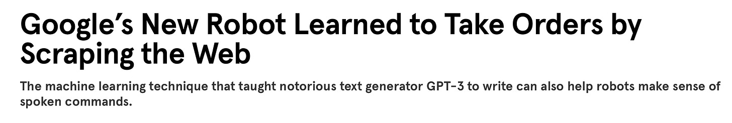 From a showmanship standpoint, Google’s new robot project PaLM-SayCan is incredibly cool. Humans talk, and a humanoid robot listens, and acts. In the best case, the robot can read between the lines, moving beyond the kind of boring direct speech (“bring me pretzels from the kitchen”) that most robots traffic in (at best) to indirect speech, in which a robot diagnoses your needs and caters to them without bothering you with the details. WIRED reports an example in which a user says “I’m hungry”, and the robot wheels over to a table and comes back with a snack, no futher detail required—closer to Rosie the Robot than any demo I have seen before.