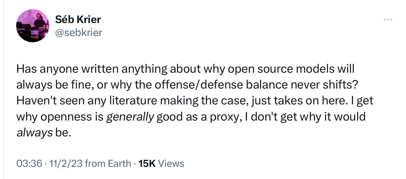 1. Nobody knows for SURE that there are no serious possible consequences of open source AI, e.g in terms of bioweapons, misinformation generation etc, as Séb Krier at DeepMind nicely highlights above.