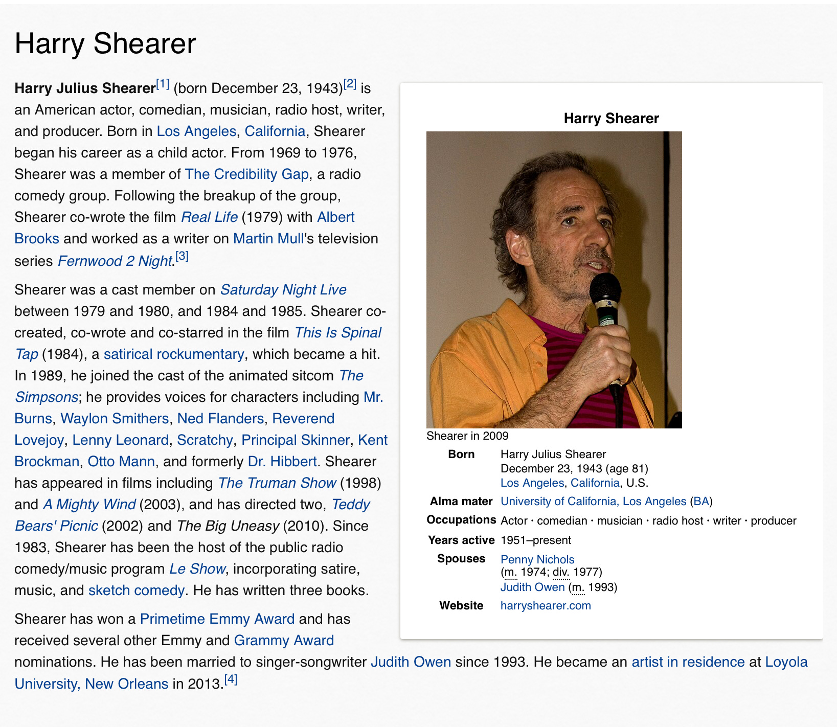 And then there are the errors of omission; Harry didn’t just play Derek Smalls, he co-wrote This is Spinal Tap, a rather important credit to omit. He wrote for and performed on Saturday Night Live, and acted in many other movies from The Truman Show to A Mighty Wind, wrote and directed a documentary about Hurricane Katrina, and so on. No mention either of lovely and talented wife Judith Owen, his radio shows or his Primetime Emmy Award or Grammy nominations, either.