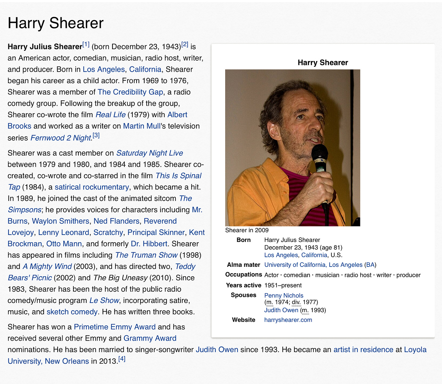 I do, however, know the legendary Harry Shearer, and was lucky enough to dine with him yesterday in LA. Antecedent to our breakfast, he sent me a problematic biography of him (“vomited by AI” in the words of a professor friend of his who forwarded it to him), along with the comment “No pet chicken, but still…”: