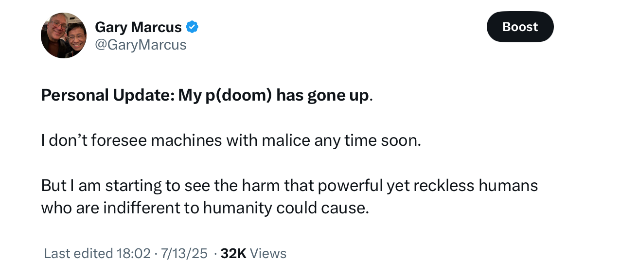 In fairness, and with a trace of optimism, I don’t think that the nightmare scenario that I am sketching is a certainty, or even close to a certainty. My p(doom) is still lower than most industry people’s. I am at maybe 3% now, much higher than a month ago, contemplating what a wealthy, reckless megalomaniac might in the worst circumstances do, But I am still betting on Team Human for the foreseeable future.
